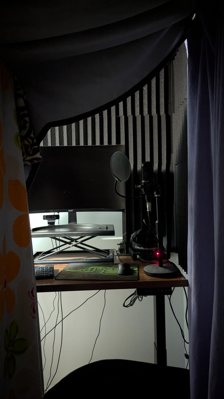 Setup: Improvised Home StudioMicrophone: Audio Technica AT2035 Cardioid Condenser Microphone w/ Yanmai PS-6 Pop FilterAudio Interface: PreSonus AudioBox USB 96 USB Audio Interface - 25th Anniversary EditionDAW: AudacityConnectivity: Discord, Zoom, Google Meet